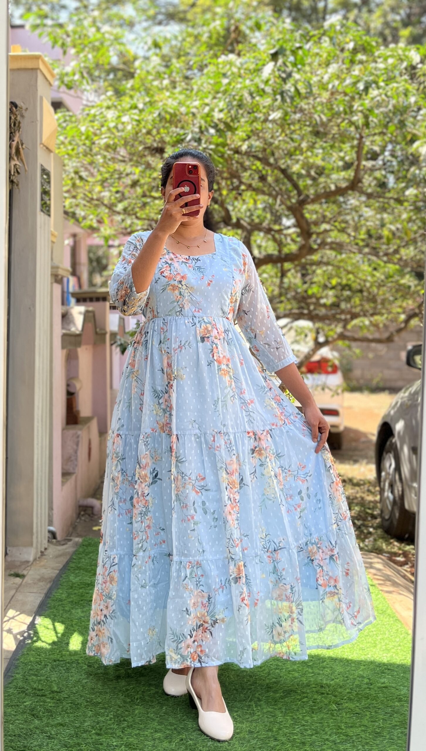 Georgette Maternity/ Feeding Maxi – 3tier Georgette Skyblue Butta